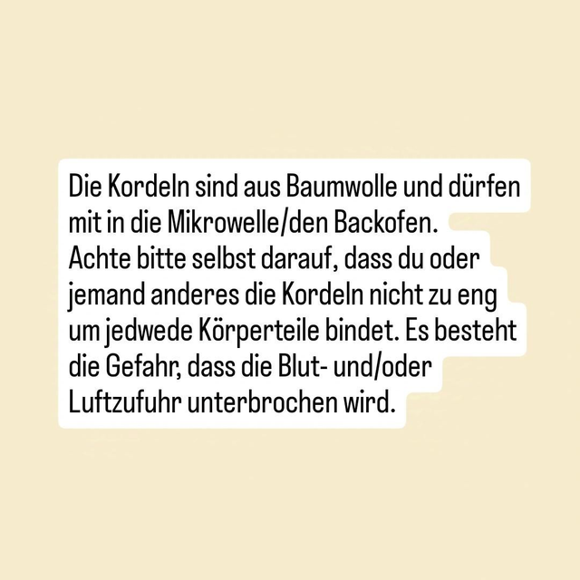 Zum Erwärmen das Rapskissen für ca.2 Min. bei 800W in die Mikrowelle oder ca.10 Min. in den Backofen geben. Dann durchkneten, um die Wärme zu verteilen und zu prüfen, ob es dir schon warm genug ist. Wenn nicht, kann es für weitere 30 Sek. in der Mikrowelle oder entsprechend im Ofen erwärmt werden. Bitte vor Feuchtigkeit schützen, da die Samen keimen könnten.