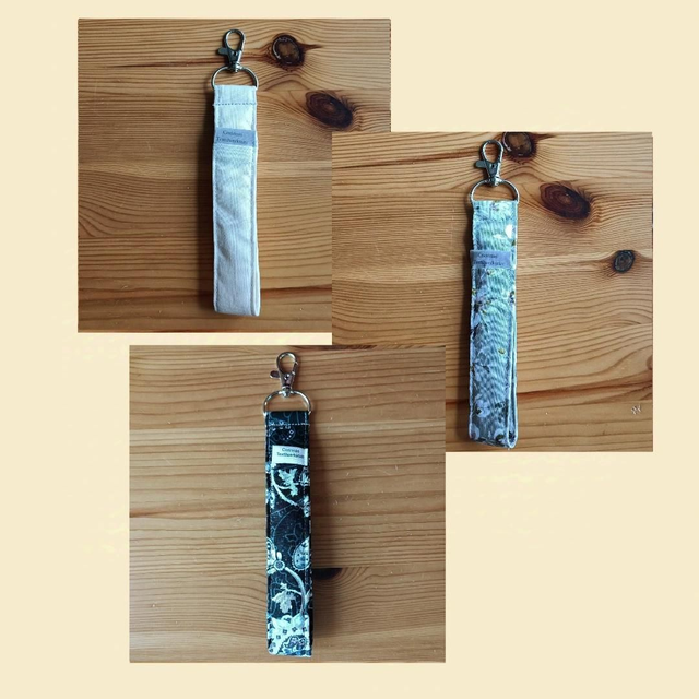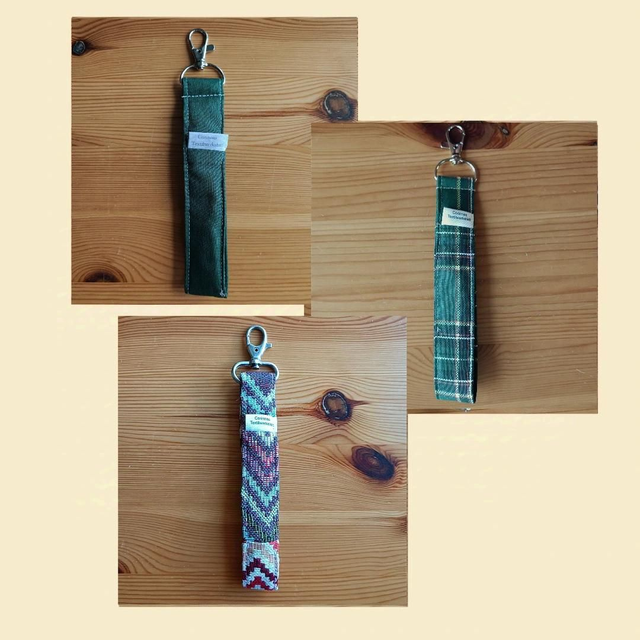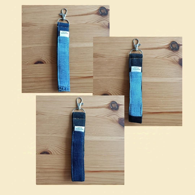 Ich habe die Schlüsselbänder aus Baumwollwebware (100% Baumwolle) mit Verstärkung genäht bzw. aus Outdoorstoff/Jeans gepatchworkt.