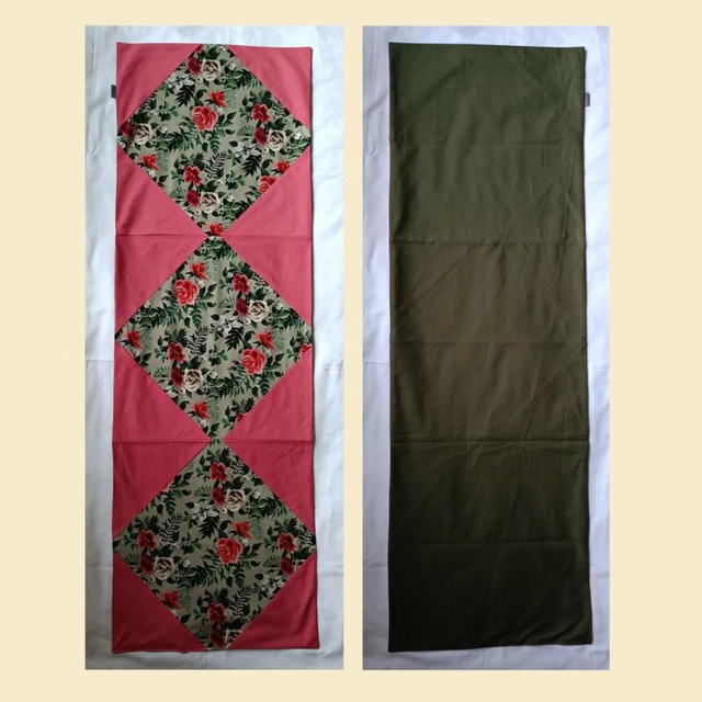 So kannst du auch diesen Tischläufer wenden. Auf der einen Seite befindet sich ein Patchworkmuster mit Rauten, auf der anderen Seite ein schlichter Stoff (jeweils aus 100% Baumwolle).